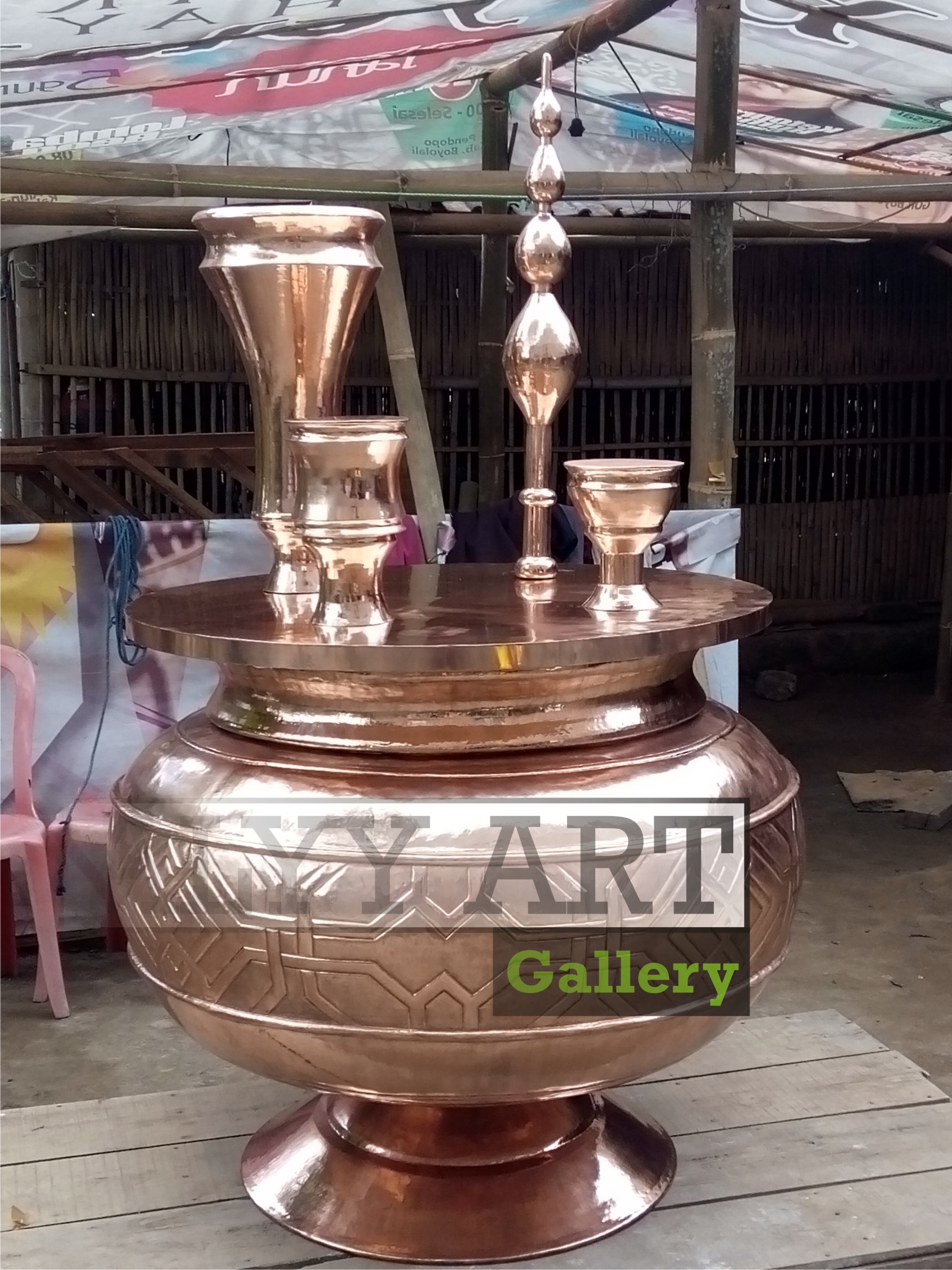 Rumah produksi kerajinan tembaga dan kuningan Alyy Art Gallery menghadirkan kepada Anda, inovasi baru produk kerajinan tembaga dan kuningan. kali ini adalah berupa kerajinan guci sekapur sirih tembaga dan kuningan, Produk ini adalah kerajinan guci sekapur sirih tembaga dan kuningan ada beberapa finishing antara lain:hitam kombinasi poles,poles,warna alami tembaga,coklat dll.agar lebih menarik kami padukan serta serasi agar terliahat lebih elegan.